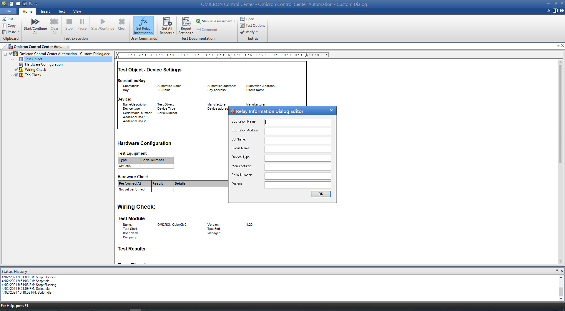 Making of custom dialog is very useful because we can change the target parameters in the test object without opining it. In few lines of codes, we can could get the test object parameter value like substation name or address, relay type, serial number & etc. and display it into a textboxes then change the textbox values and sent it back to the test object.